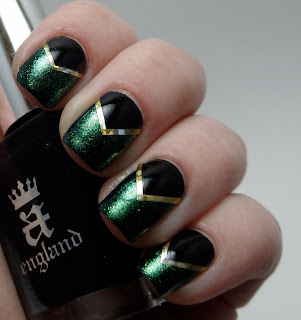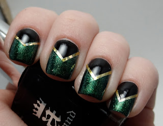 For these nails, I used two coats of Zoya Logan and one coat of A England Camelot. Camelot is the most amazing black polish I've ever used. Opaque, shiny, and perfectly smooth in one coat, I highly recommend it! I outlined the black triangles with some gold striping tape to finish this manicure, along with one coat of INM Out the Door fast drying top coat.
