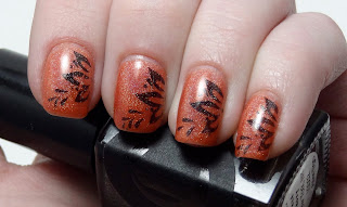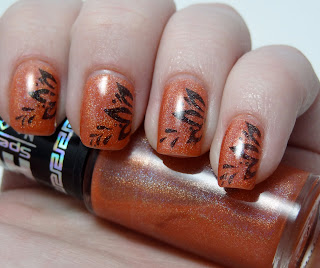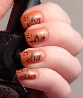 Fortunately, holo helps me forget how much I hate orange. A lot of people say that glitter fixes everything...I say holo fixes everything! For the flowers, I used Cirque Alter Ego (a gorgeous black holo, I'll post a swatch including the ring later) and a design from the RA-119 stamping plate. The holographic finish was hard to capture, but you can see some of it in the last photo.