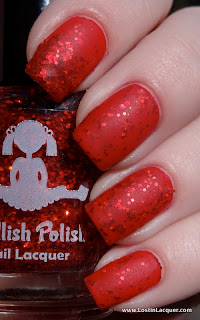 This is Dollish Polish I Wanna Do Bad Things With You over Butter London Pillar Box Red. I used one coat of the glitter of Pillar Box Red, which the except of the index finger which is a glitter gradient accent nail. I decided to finish this manicure off by applying a layer of matte top coat. Matted glitter looks so cool. If you haven't tried matting your glitters yet, I highly recommend it!