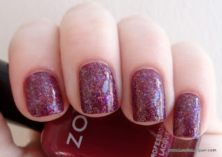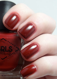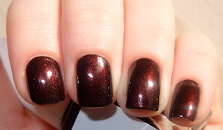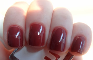 Deborah Lippmann Jessa. Two coats, except the middle finger which has three coats for comparison. A "bohemian burgundy," which is a pretty accurate description of this shade of red. It gets a lot darker with three coats; I personally prefer it with two. Sorry for the weird picture, it was hard to get an angle that showed off the color properly.