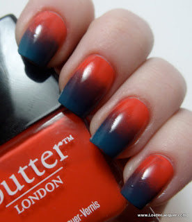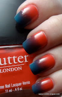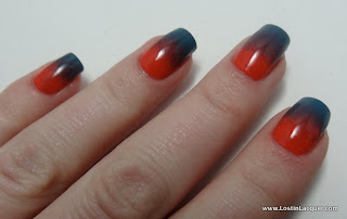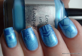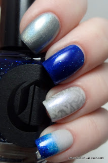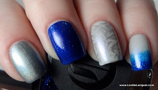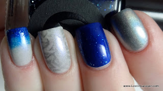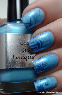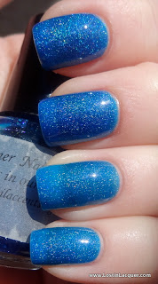 Julia. Four coats on the index and middle nails, three on the ring and pinky. This bright blue holo is named after Amanda's sister, aww! What I really like about this polish is how drastically it changes colors between coats. With four coats it looks dark blue, but with just three it's this really bright, vibrant blue color. It's almost like having two polishes in one! The formula on this one was also good, but the polish is a bit sheer.