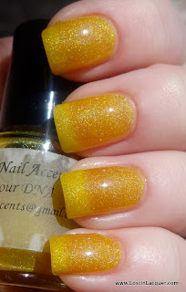 really sheer. I would definitely suggest some white or yellow undies for this one. With my pale skin this makes me look jaundiced, but on darker skin tones I could see it looking nice. The color is unique though. I can't say I own any yellow holos!