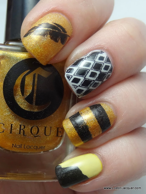 I started with a base of Cirque Chyrsopoeia for the index and ring finger nails. This is a gorgeous dark yellow/gold holo. I'm so glad I had this color or I'm not sure what I would have done! The middle finger has a base of OPI My Boyfriend Scales Walls. The pinky has a base of Color Club Almost Famous with Julep Blake on to create the light yellow color. I used Konad stamping polish in black in combination with the BM21 (diamonds) and BM15 (feather) stamping plates. Finally, I added the stripes squiggle black thing using some tape.
